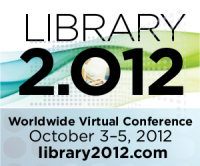 The Library 2.012 Worldwide Virtual Conference will be held October 3 – 5. The conference will be online, in multiple time zones over the course of two days, and free to attend! The School of Library and Information Science (SLIS) at San José State University is the founding conference sponsor. Register as a member of this Library 2.0 network to be kept informed!