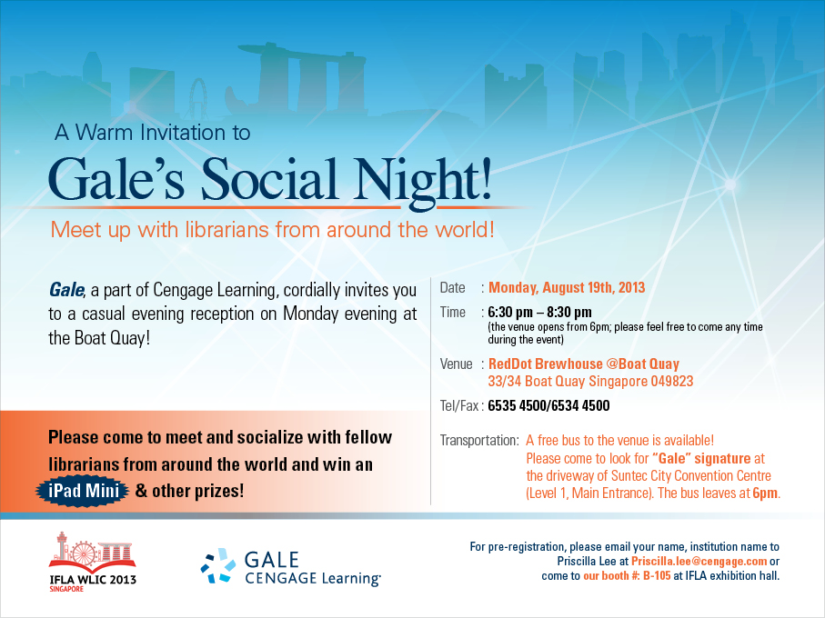 I trust you all heard about this via a Google Group emailing, but tonight Gale Cengage is hosting a reception for all librarians — in connection with the ongoing IFLA Conference here in Singapore.