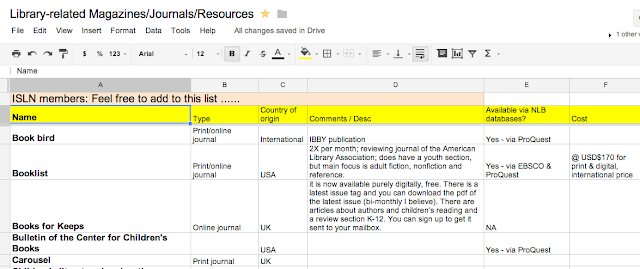I’d been meaning to make a list of all the library-related journals available via the NLB (no longer freely available to us – sigh), but never got around to it. Then Anthony Tilke, the new secondary TL at the UWCSEA Dover campus, started making a list of library and book review journals and their priees/availability for our internal purposes — and I said, oh, let me make it the start of an ISLN shared resource.