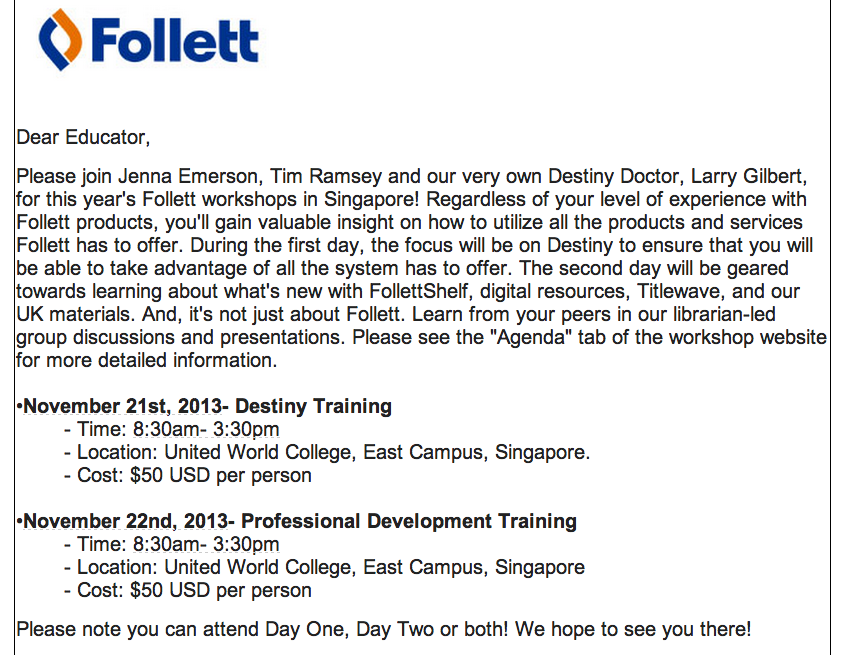 Jenna Emerson, Tim Ramsey, and Larry Gilbert are running a Follett Workshop in November at UWCSEA East.