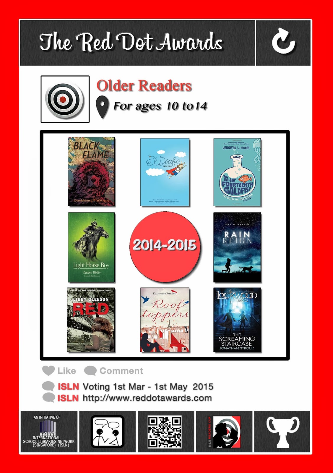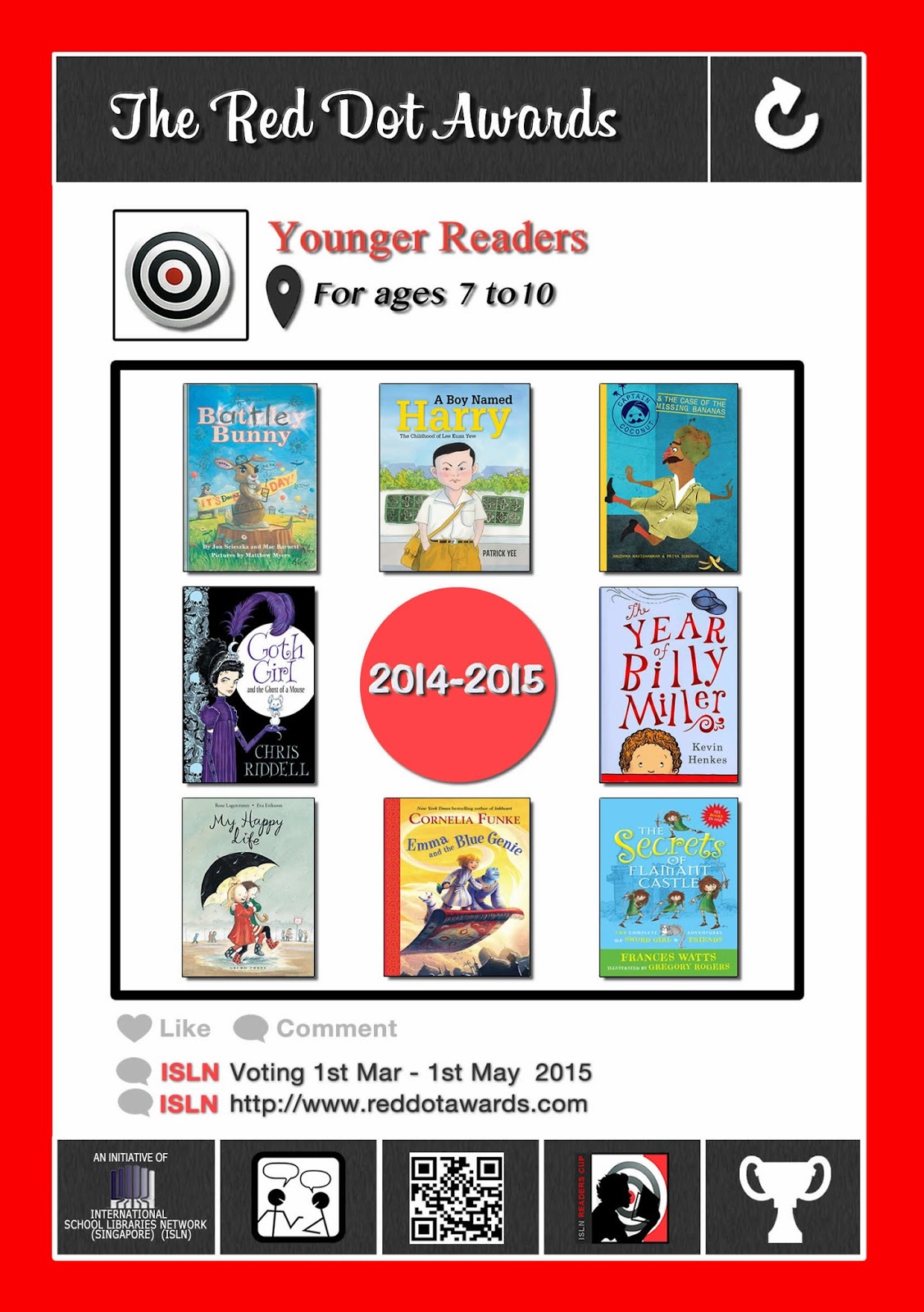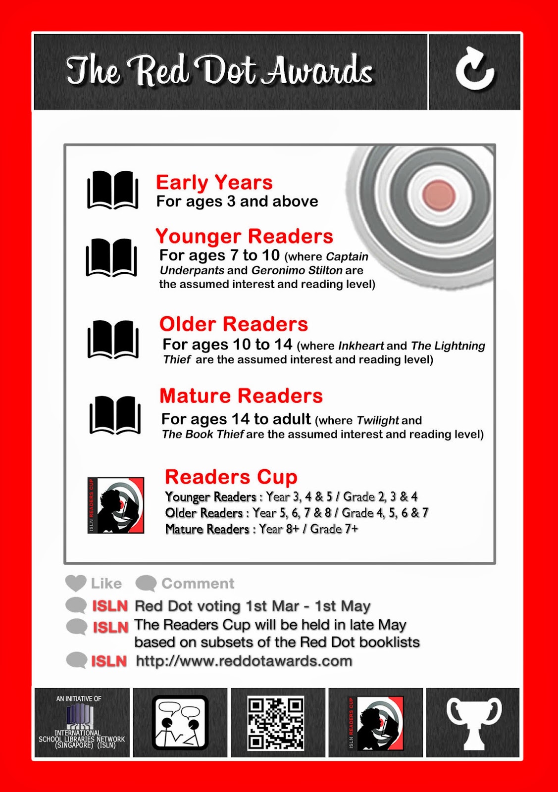 Thanks to my very creative library assistant, Ernie, here are some posters for the four categories of the Red Dots, plus some shortlist stickers. Go to the Red Dot Promotional Materials page to find them.