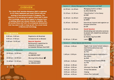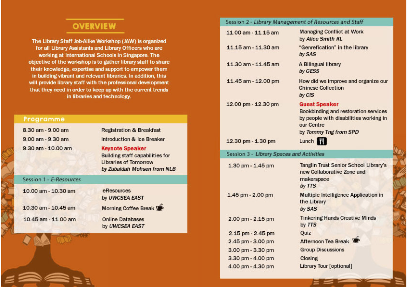 Friday, October 21, the library staff at UWCSEA East hosted the first annual Job-Alike Workshop (JAW) held here in Singapore, based on one held last year at Alice Smith School in KL.